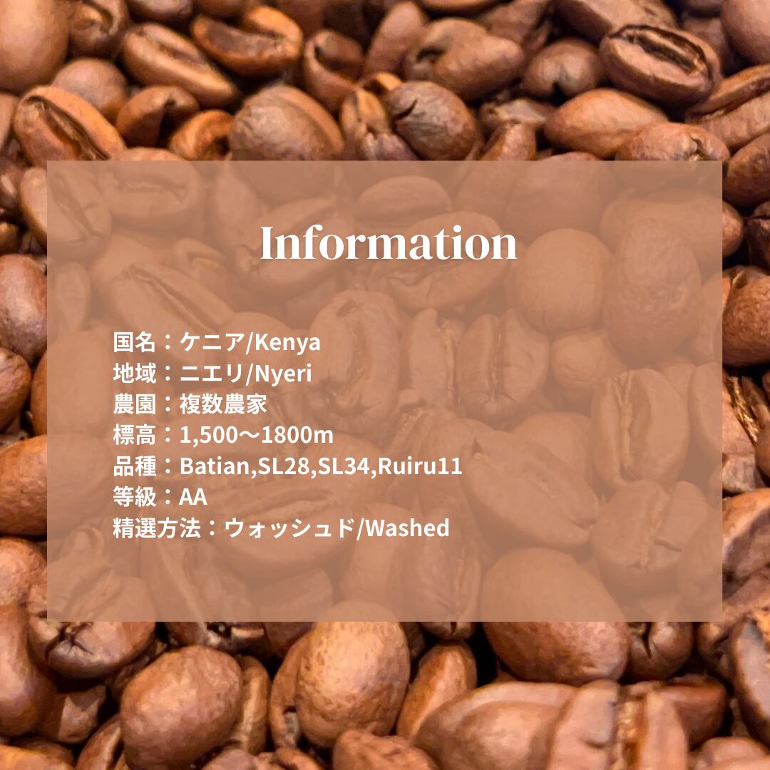 ケニアらしいテロワールを残しつつ、ローストナッツの風味を感じて頂けるよう焙煎した中深煎りのコーヒーです。