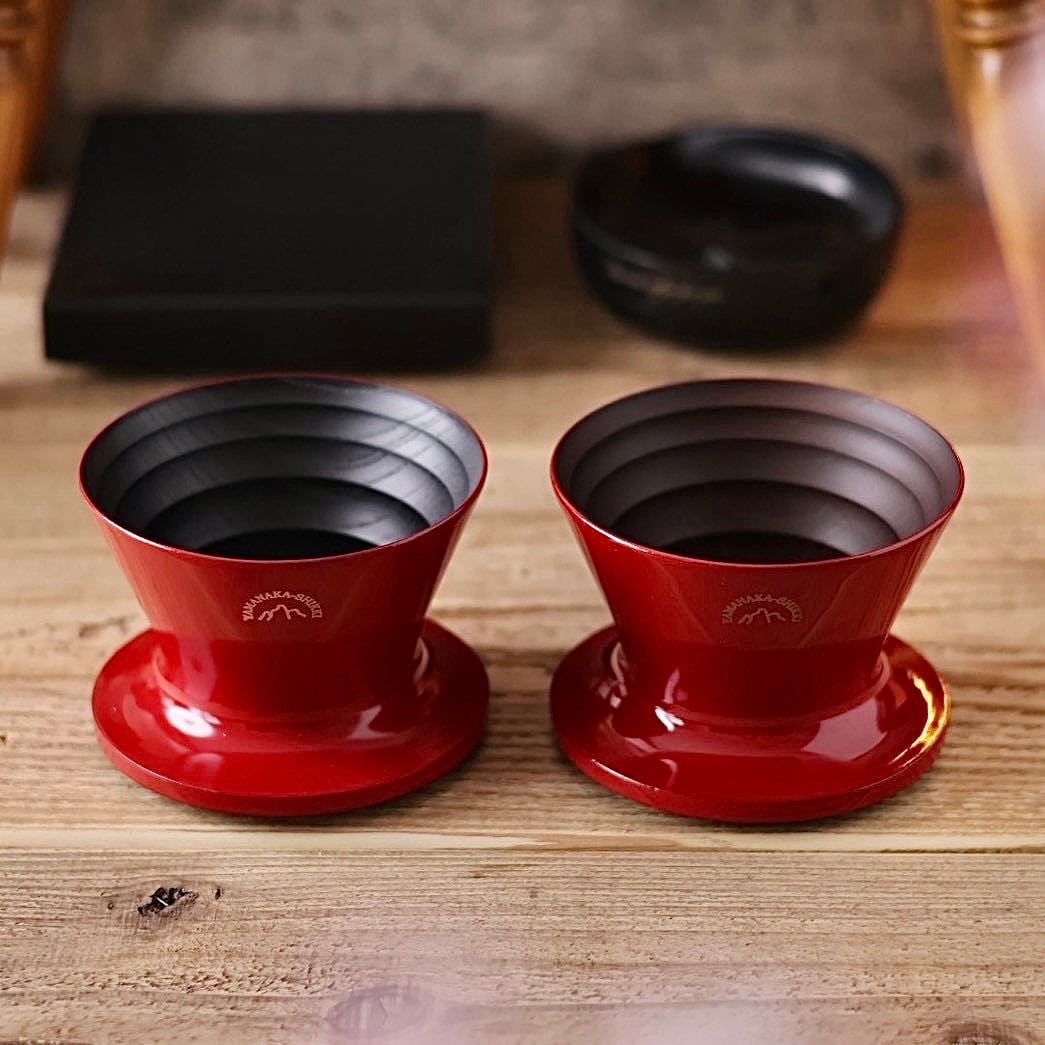 「山中塗り」の代名詞でもある漆の光沢と、内部の木材部とのコントラスト表現により、コーヒー空間において圧倒的な存在感を放ちます。