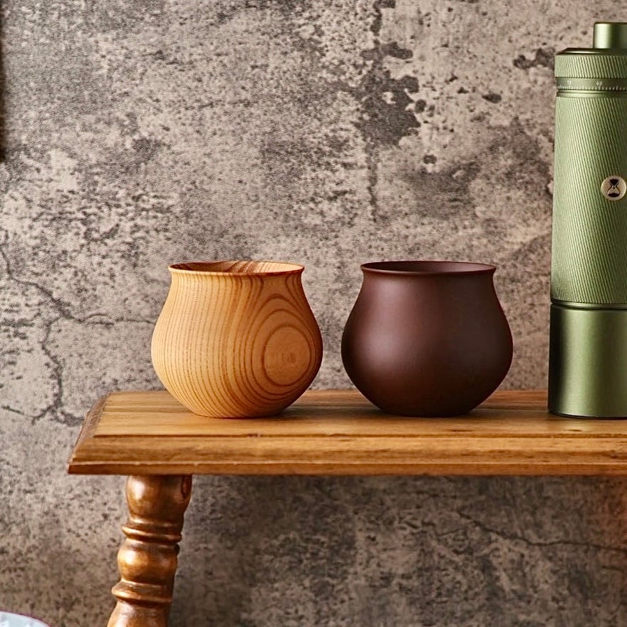 ワイングラスのような構造によりコーヒーのアロマが鼻付近に集中する事で、コーヒーの風味体験を最大限に引き出すことを可能としているのが「木の器」です。